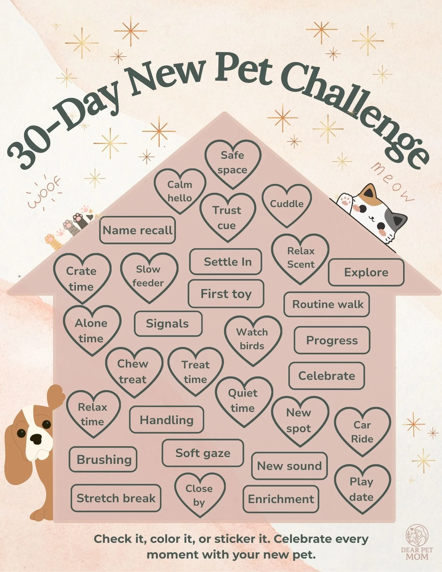 This simple, beautiful challenge gives you one small activity each day to help your pet settle in, build trust, and feel safe in their new home.